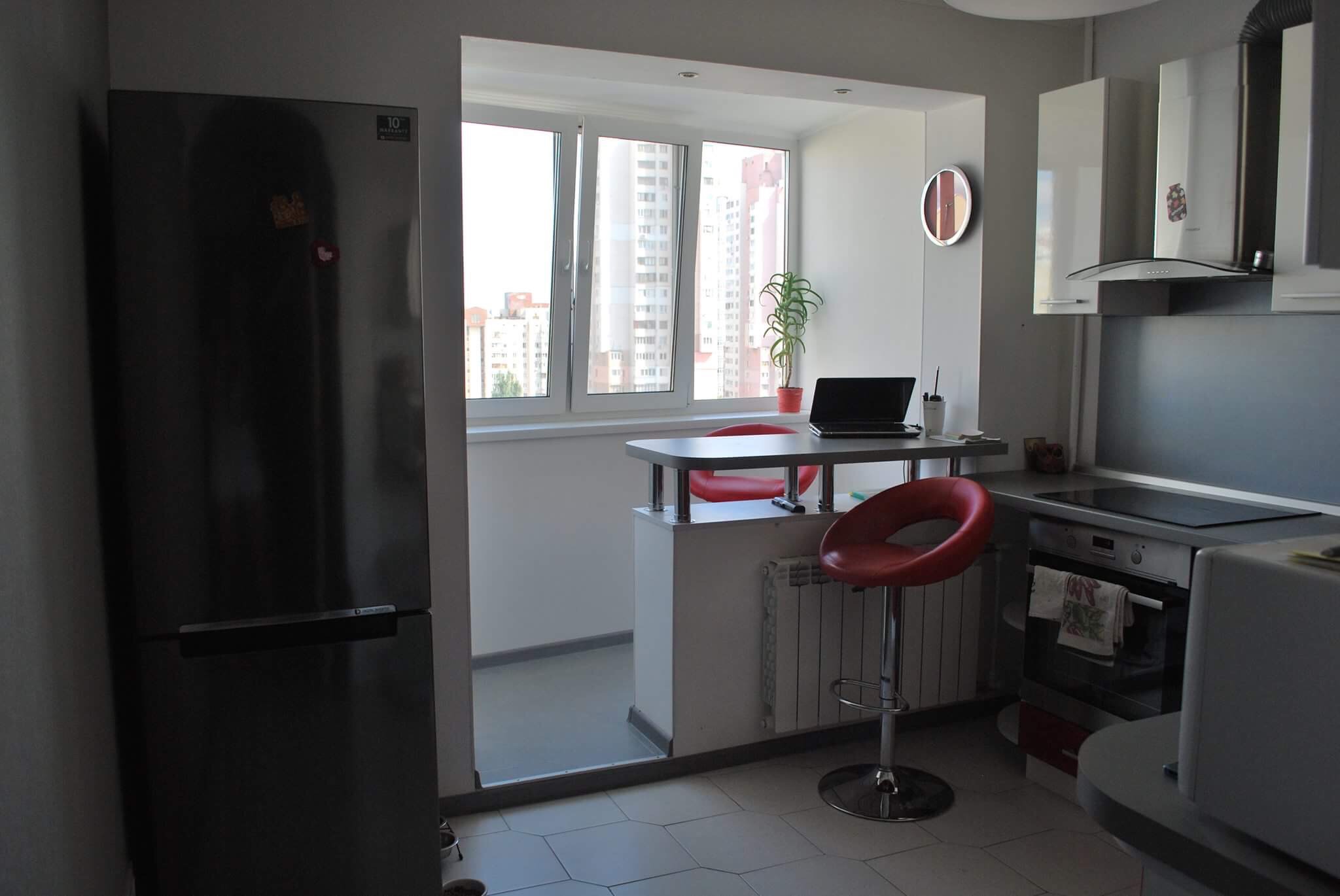 - балкон утеплён и соединён с кухней, размещена барная стойка вместо стола