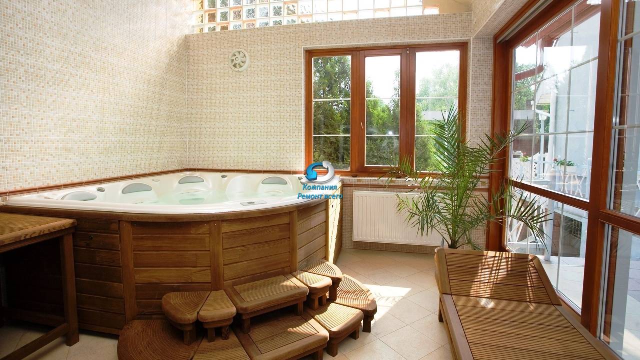 - Отделка всех поверхностей надежными, влагонепроницаемыми облицовочными материалами, например, керамической плиткой, натуральным и искусственным камнем, стеклоблоками. Большой популярностью в последние годы пользуется особая технология укладки пола — обустройство «теплого» пола.